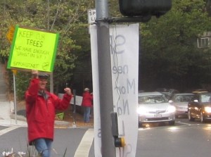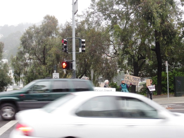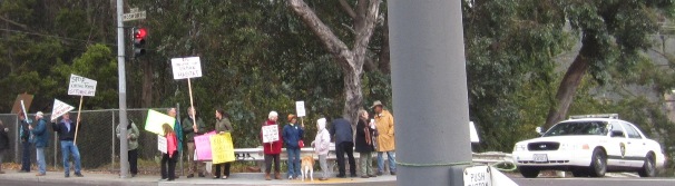 In fact, when I trudged up the steep slope of Elk, a few minutes late, I counted over 30 people there already. The organizers had promised not to block the sidewalk, so the group spread out and stood on each of the corners of the intersection.