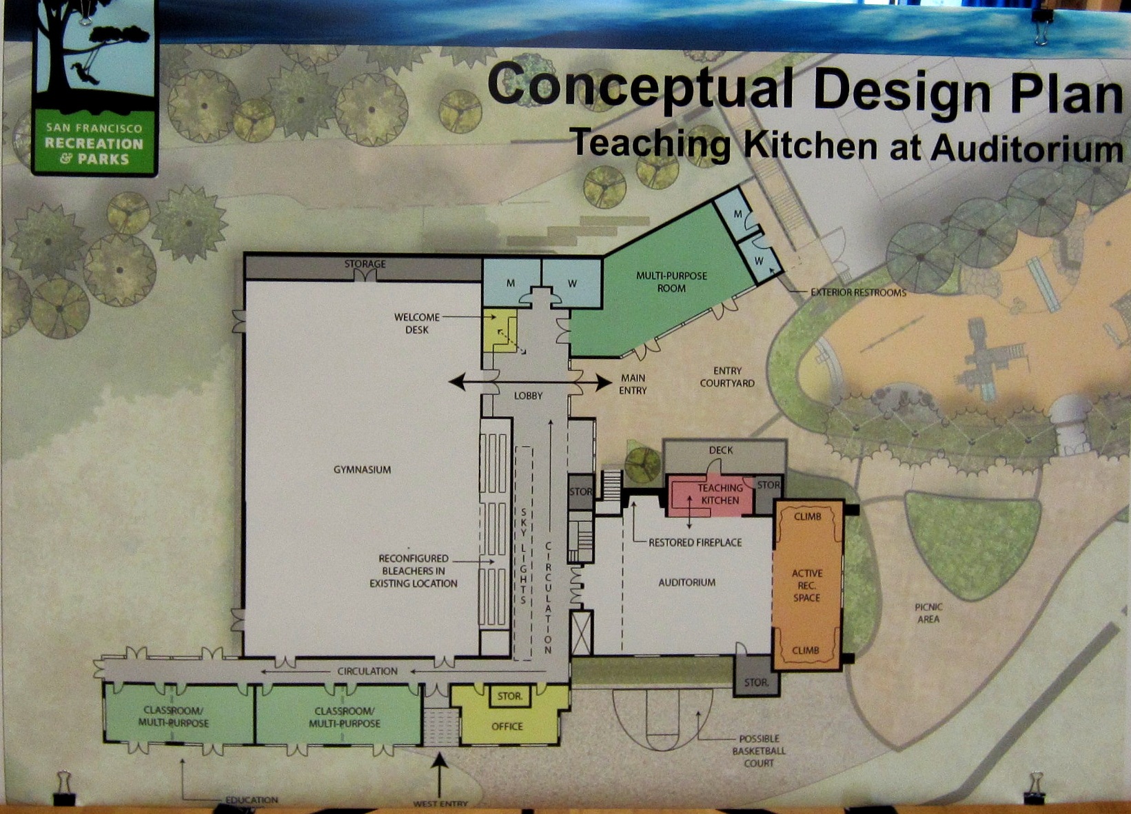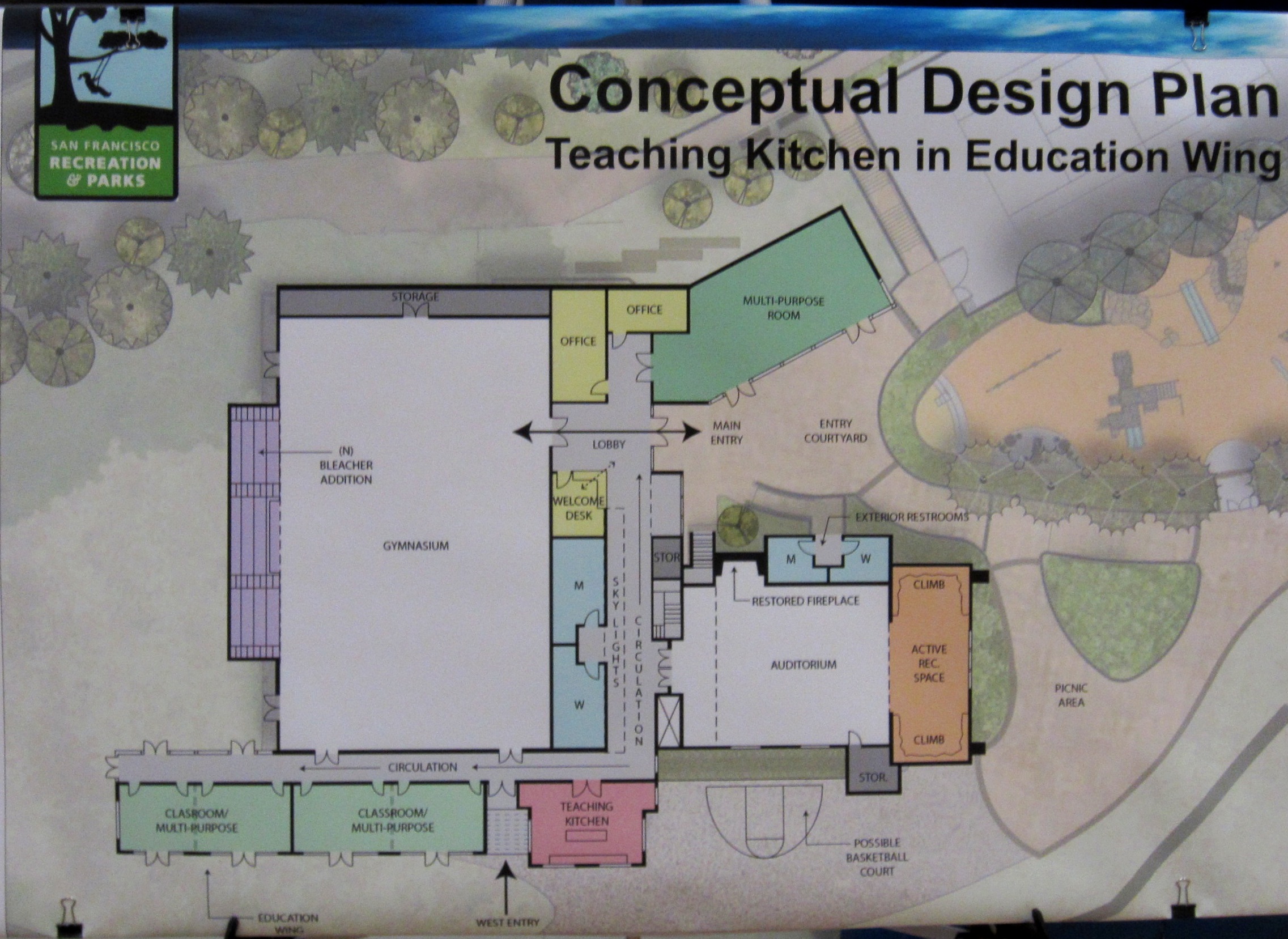 - A Significant Front Entrance will be created, with a staffed “welcome desk.” This is NOT a receptionist, there’s no budget for one nor is there likely to be. The Plan was vague about who would sit at that desk, though someone said that would be the de facto office of the Director of the Rec Center. (The actual admin offices shown in the plan are for someone else – SFRPD employees of some kind. It wasn’t entirely clear.)